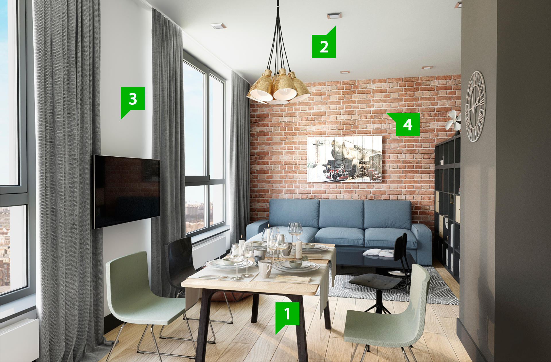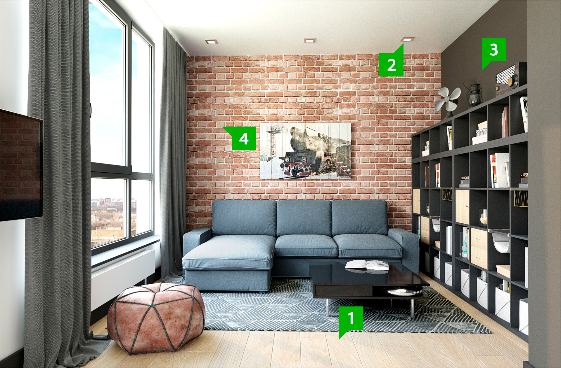 Лофт отвергает гламурность и вычурность, являясь символом свободы, творчества, нестандартности. Это подчеркивается свободной планировкой гостиной, большими окнами, минимальным набором мебели.
