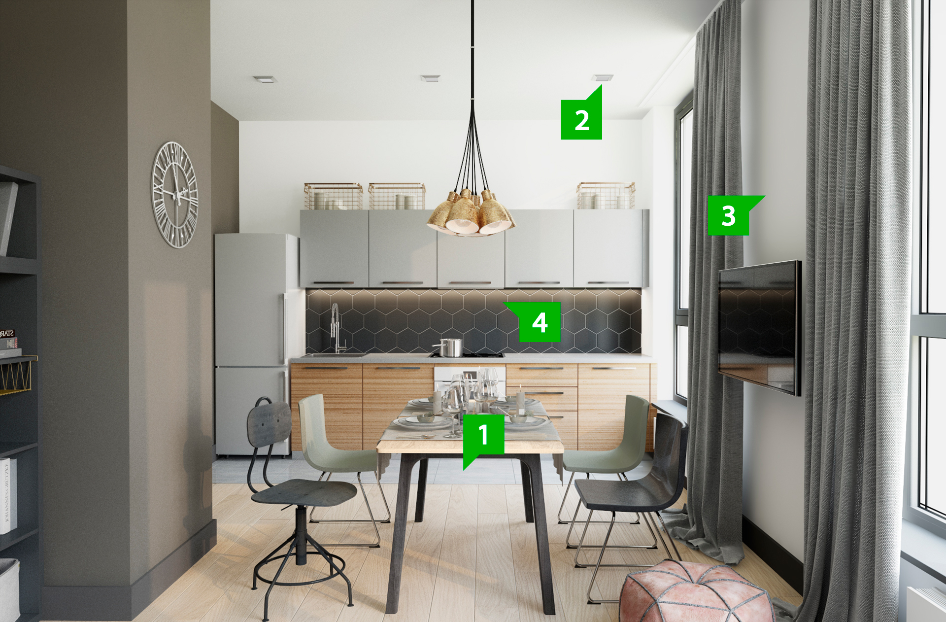 Подборка по комплектации подвесными светильниками, бра, кухней, мягкой и корпусной мебелью,