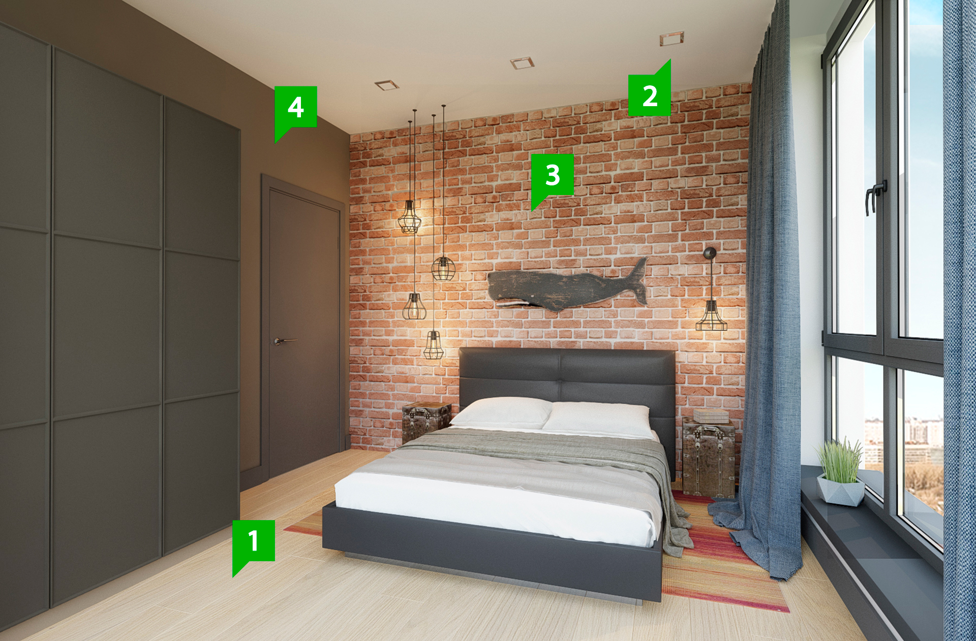 Оформление стен спальни выполнено на основе контрастных сочетаний: белый, серый, а также стена с покрытием Clay, имитирующим кирпичную кладку. Концепция урбанистического интерьера поддерживается за счет «холодной» цветовой гаммы, которая смягчается с помощью «деревянного» напольного покрытия. В качестве отделки использован ламинат коллекции Super Natural Classic торговой марки Kronospan. Набор мебели минимален, основная роль отводится удобной большой кровати, шкафы глухие, с лаконичным оформлением фасадов.