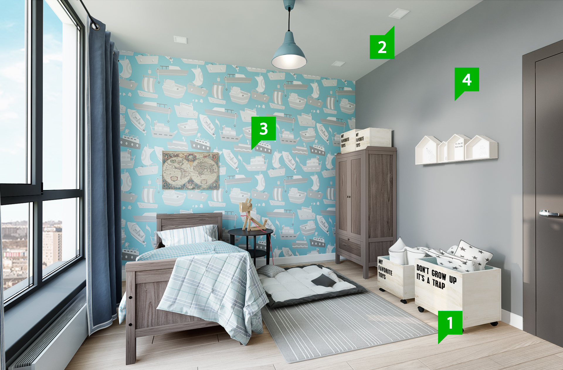 Идея индустриальности, присущая лофту, поддерживается за счет минималистической палитры оттенков. Стены выкрашены экологичной и безопасной краской Tikkurila, для центральной стены использовано оформление обоями Respace. Интересный дизайнерский прием позволяет «разбавить» строгость лофта, создать нужную атмосферу.