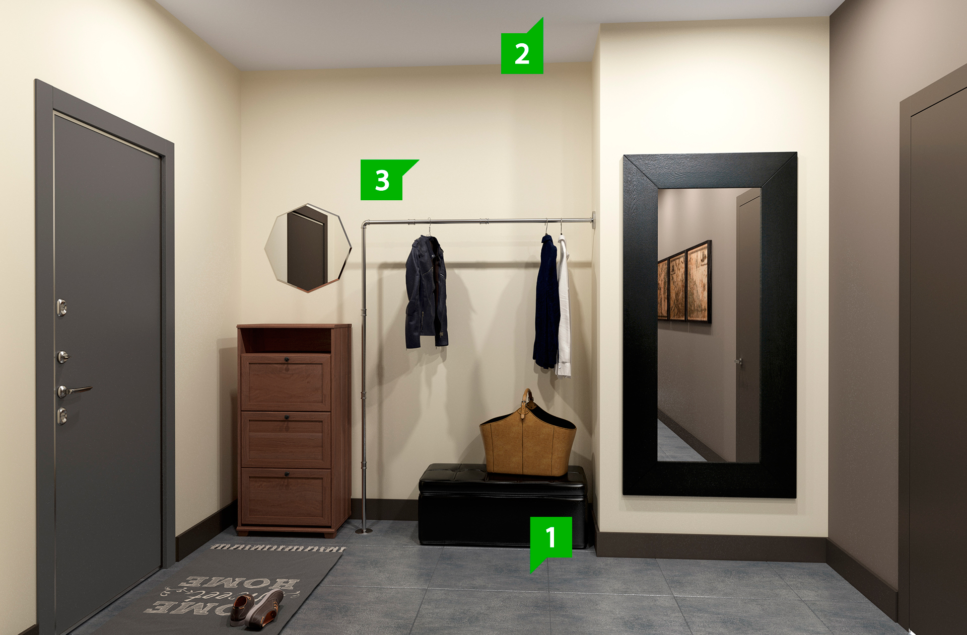 Светлые стены входной зоны гармонично смотрятся с темными оттенками противоположных стен, темная широкая рама зеркала стильно выглядит на общем светлом фоне. Обязательный элемент лофтового интерьера – кирпич или керамическая плитка в этом помещении присутствует в качестве напольного покрытия (использована плитка «под камень» от Kerama Marazzi).