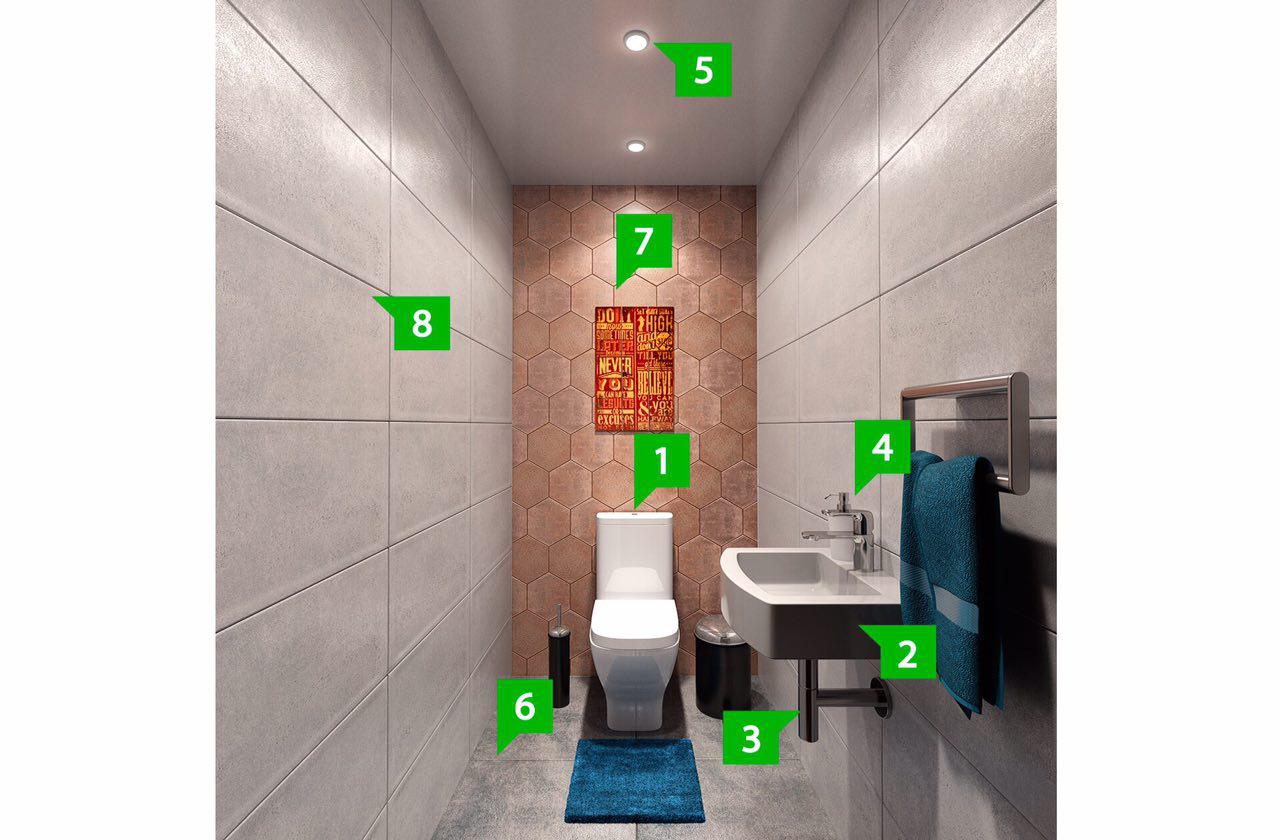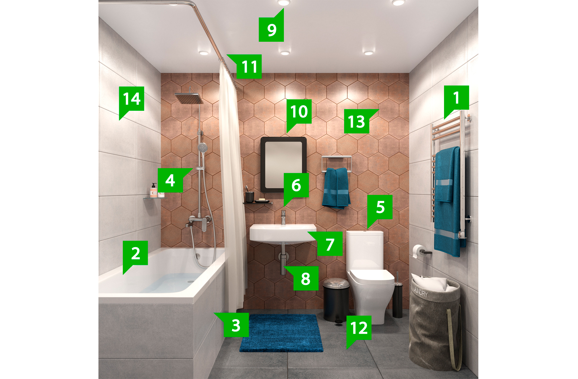 Ванная оборудована сантехникой от лучших мировых производителей: испанской Roca, швейцарской Geberit, немецких Bravat, Elghansa, Hansgrohe. Предусмотрено общее освещение, а также локальная подсветка (светильники Lightstar). Аксессуары ванной – производство IKEA (Швеция).