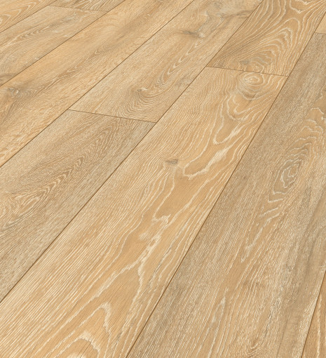 Разделение зоны гостиной и кухни выполнено при помощи напольных покрытий. Для гостиной – это ламинатные панели Kronospan с оптикой натурального дуба, для кухни – неполированная плитка коллекции Викинг от Kerama Marazzi.