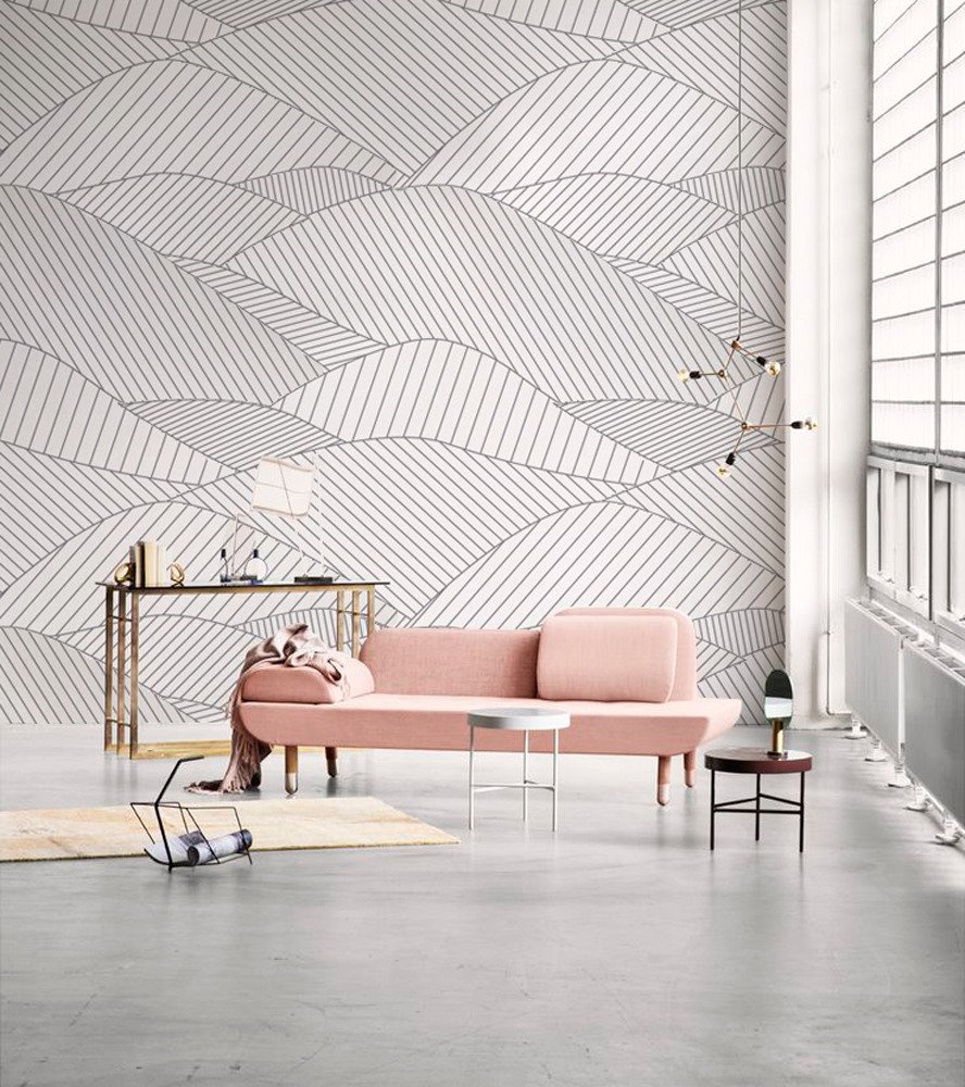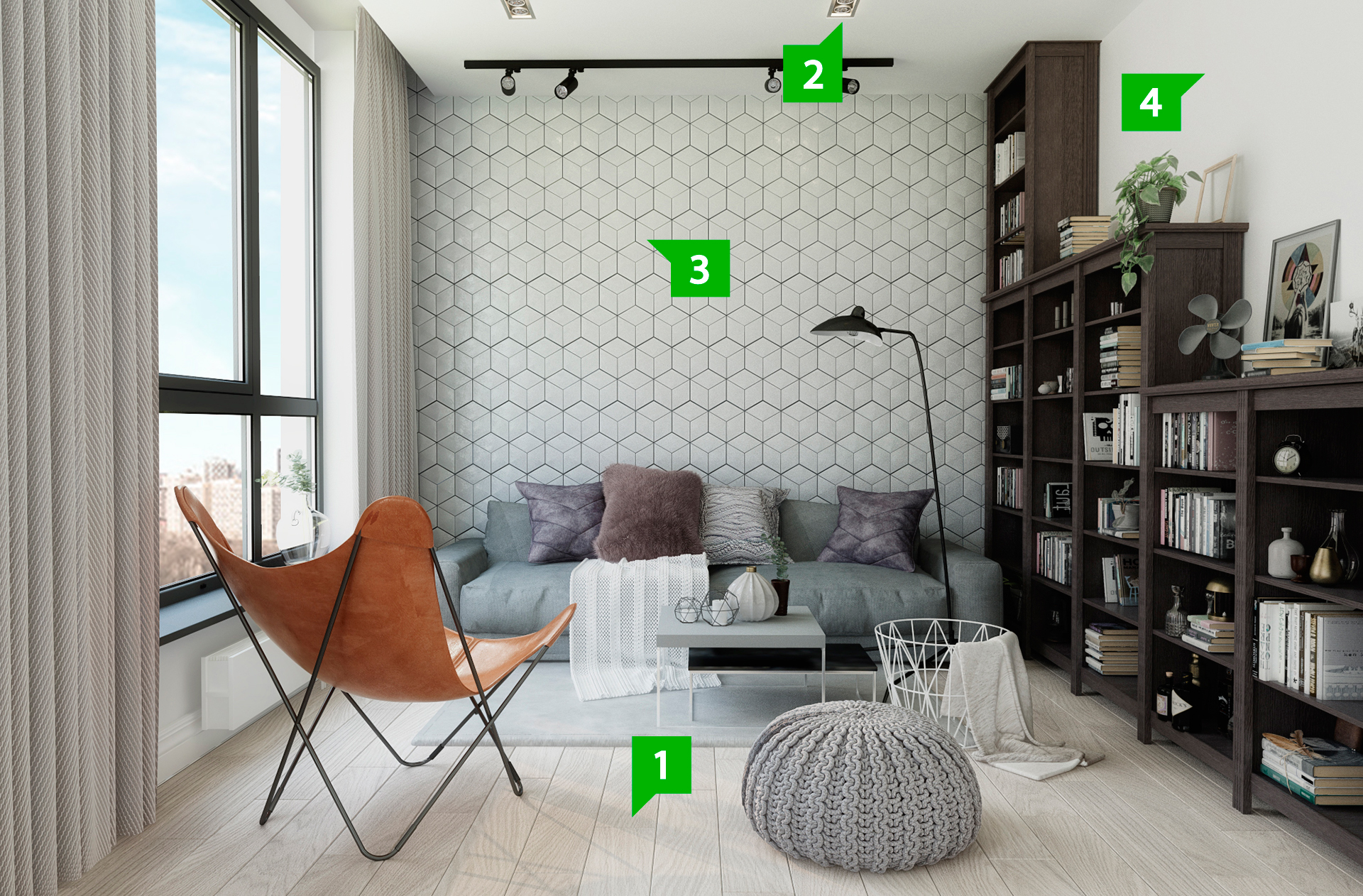 Благодаря большому окну и нейтральной краске стен комната наполнена светом, создано ощущение свободы и простора. Для напольного покрытия использован экологичный влагостойкий ламинат Sensation от шведского бренда Pergo красивого цвета с фактурой натурального дерева. Яркость интерьеру придает центральная стена, оформленная с применением фантазийных обоев от Respace.