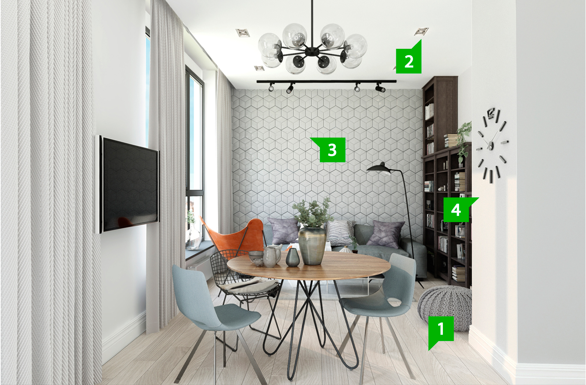 Объединение гостиной и кухни потребовало применения специальных планировочных решений, при этом обойтись без перегородок.