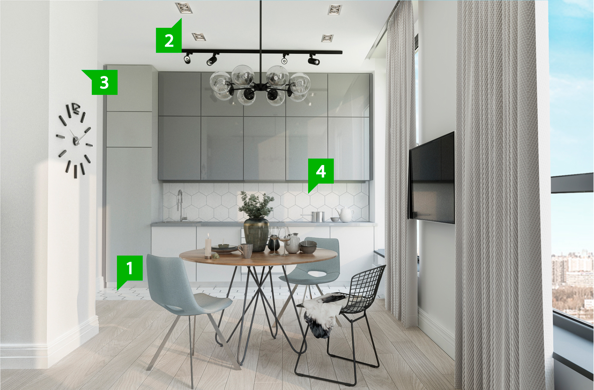 Зона кухни выделена оформлением стены – керамическая плитка Буранелли от Kerama Marazzi (Россия), а также напольным покрытием (плитка с матовой поверхностью моноколор). Предпочтение отдается естественному свету, который попадает в кухню через большое окно, также используется светодиодная подсветка от итальянского производителя Arte lamp. Материал светильников – металл, что не выбивается из основной концепции, а только подчеркивает эффектность оформления.