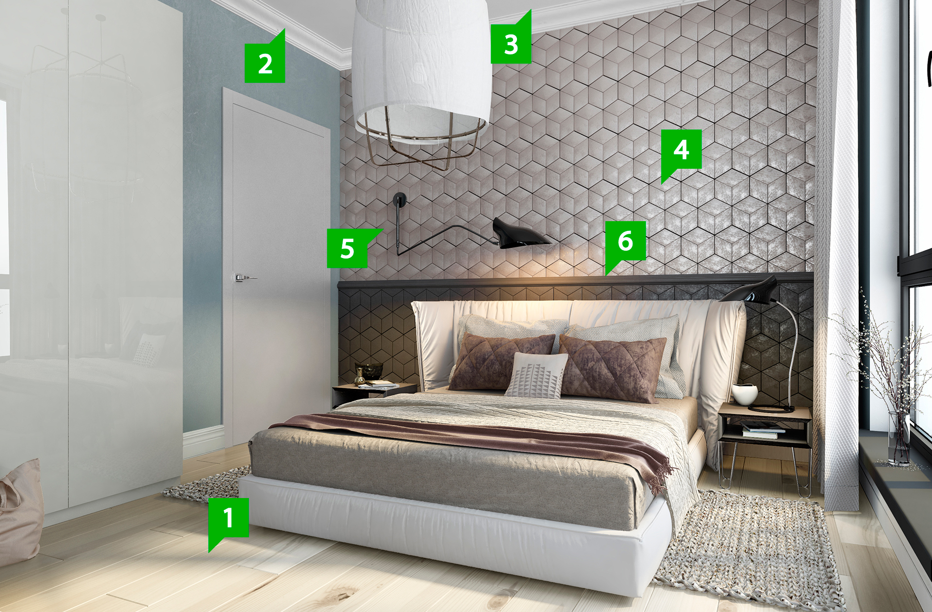 Нейтральный общий фон спальни создан за счет применения однотонной отделки стен (краска Tikkurila, цвета Луна и Уран), при этом сделан акцент на изголовье кровати. Материалы – 3D панель TRIMIC, молдинги ORAC DECOR.