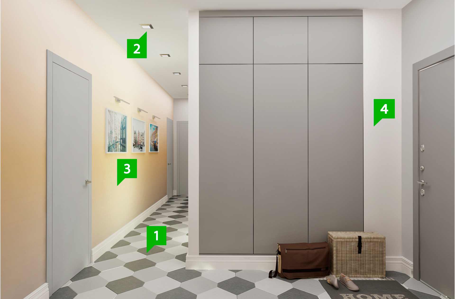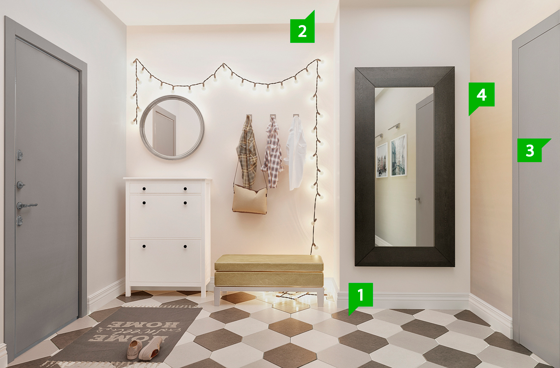 В прихожей нет резких контрастов в отделке, но присутствуют яркие элементы – мебель, аксессуары.