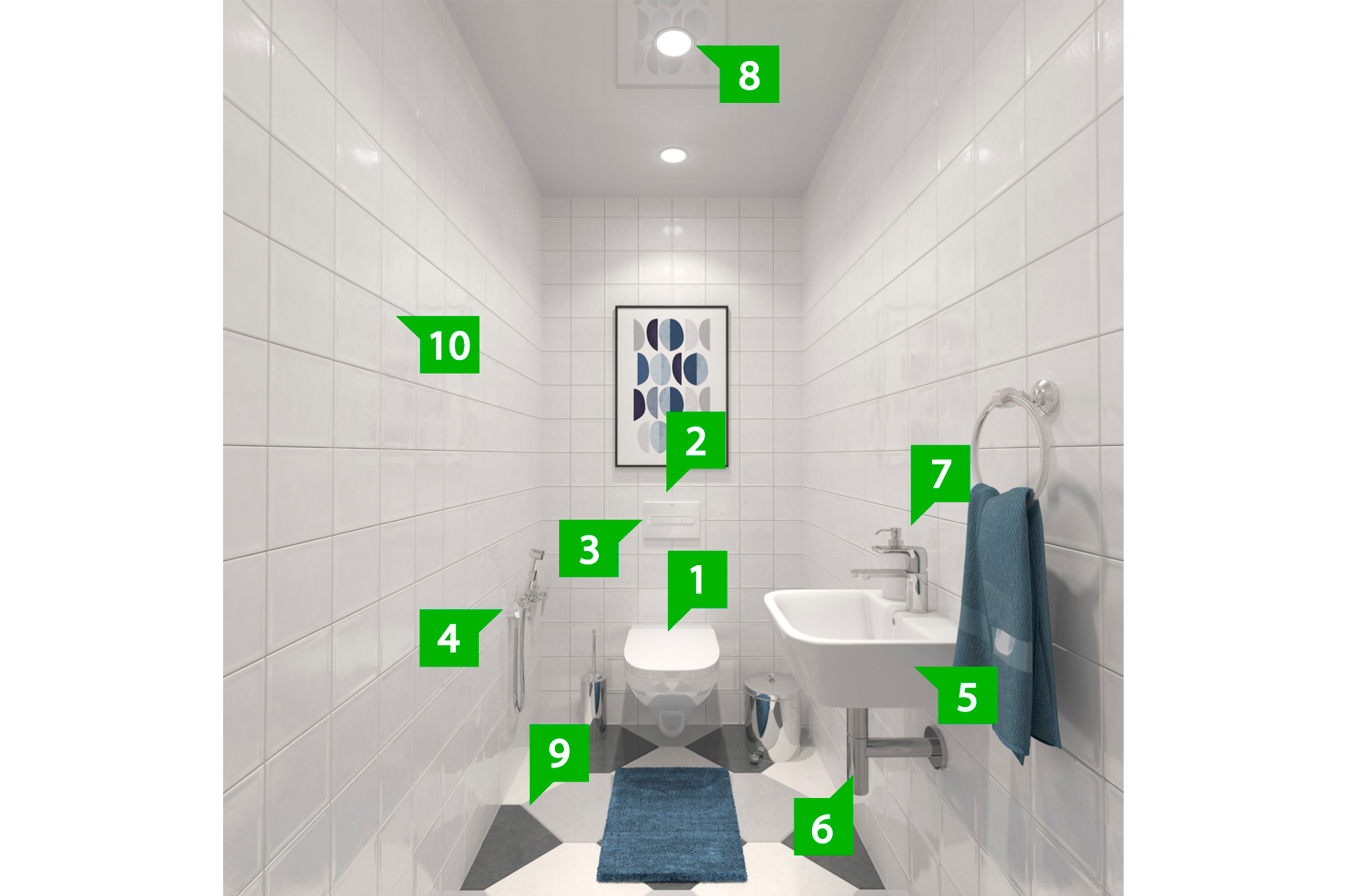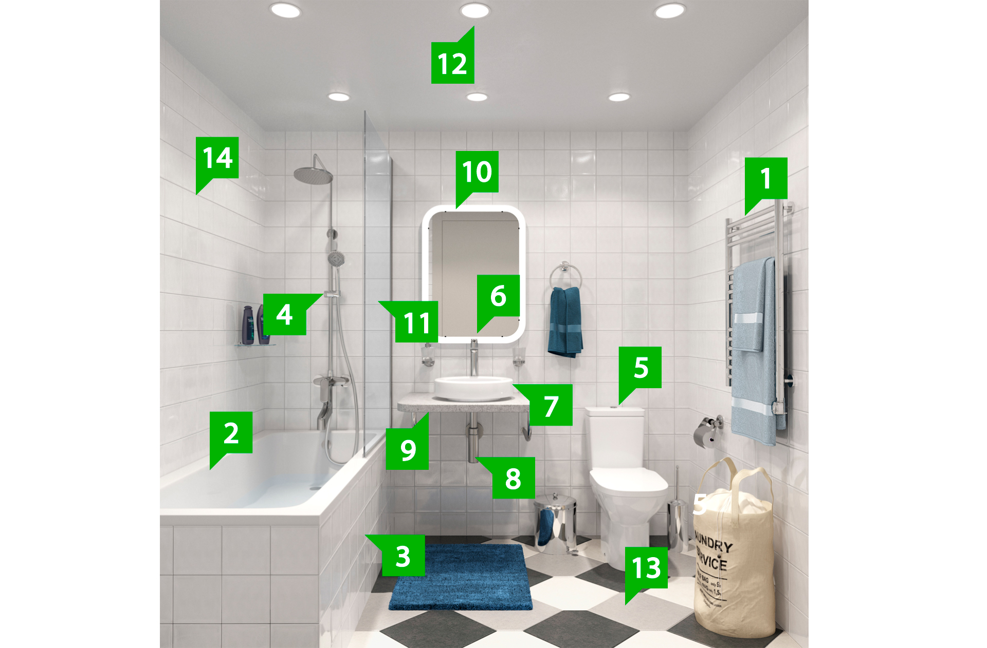 В ванной проведен монтаж сантехники от известных производителей – компаний Geberit (Швейцария), Hansgrohe, Elghansa (Германия), Roca (Испания), Lemark (Чехия). Освещение – практичные и надежные светодиодные светильники ITALLINE (Италия). Обязательным является наличие большого зеркала (IKEA), элегантных аксессуаров.